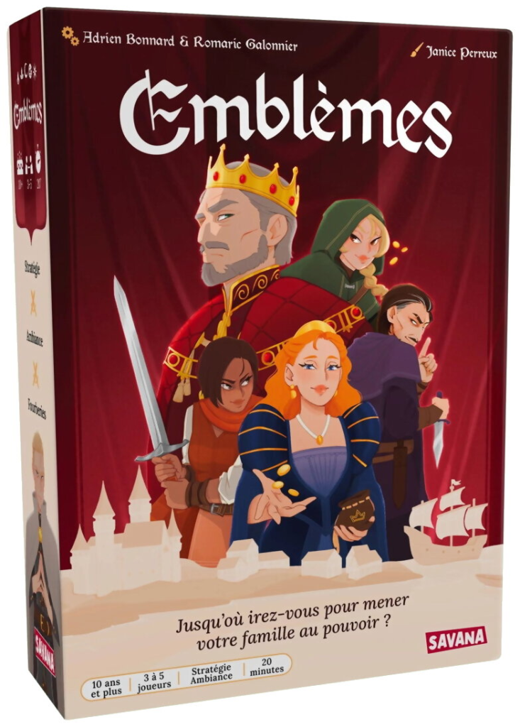 Dans le jeu Emblèmes, le roi est mort sans héritier et le royaume est en ébullition. Chaque joueur incarne une famille ambitieuse, prête à tout pour asseoir son influence sur trois lieux stratégiques : le Château, le Village et le Port.