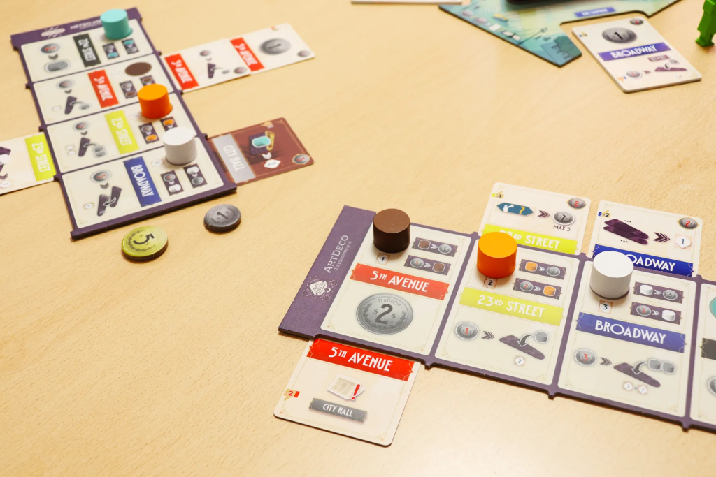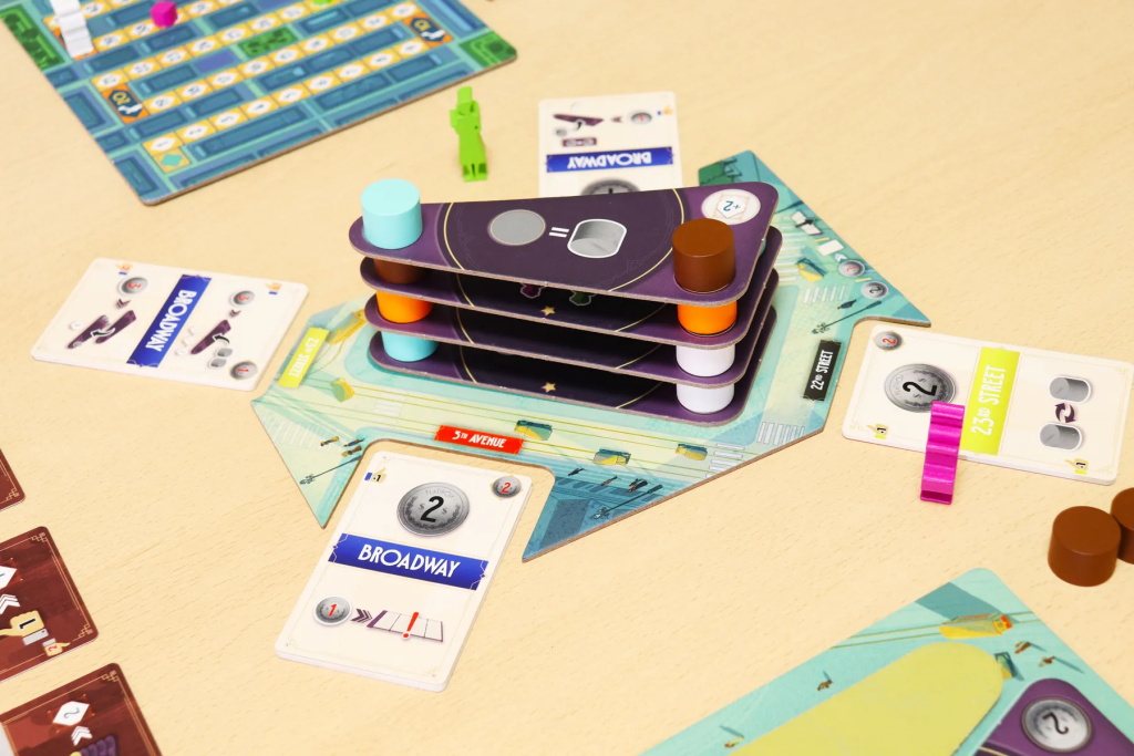 Chaque joueur possède un plateau personnel divisé en quatre colonnes, représentant les rues autour du chantier du Flatiron. Ces colonnes accueillent des cartes glissées les unes sous les autres, créant un moteur de plus en plus puissant.