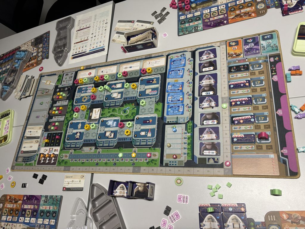 Une fois ouverte, la croisière spatiale laisse vite place à un eurogame pur jus. Le thème ? Oui, il est cool. Derrière, c’est un vrai tableur cosmique : optimisation, calcul, planification, gestion de ressources, pose d’ouvriers avec juste ce qu’il faut d’interaction. Pour envoyer tes touristes dans l’espace, il faut assembler une fusée pièce par pièce, trouver les bons clients, les nourrir, gérer ton oxygène, ton carburant, recruter une équipe, améliorer ta réputation, investir dans la technologie… une usine à gaz, ou plutôt à propergol.