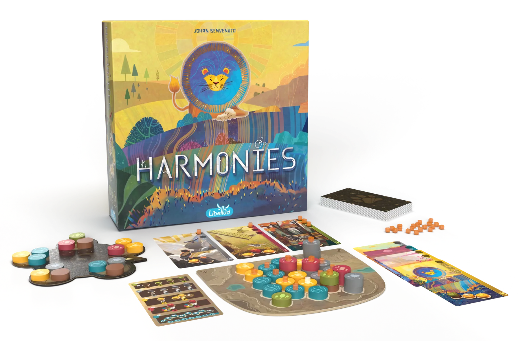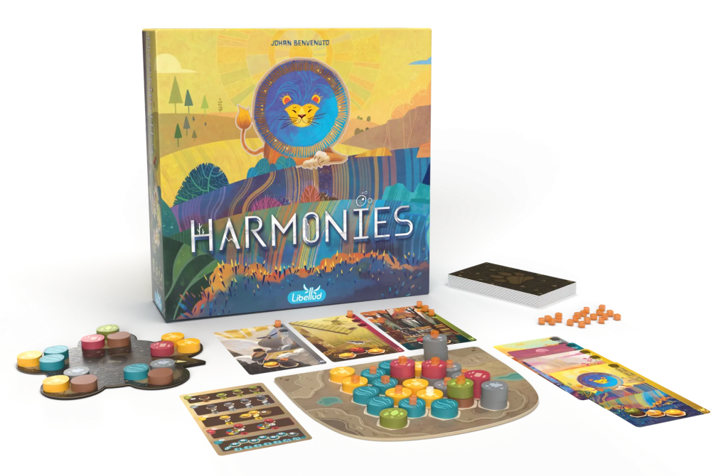 Harmonies propose de créer un paysage miniature en combinant couleurs, volumes et habitats, dans une ambiance calme et accessible. Le jeu séduit par son esthétique forte et par une mécanique simple qui devient rapidement stratégique. Une invitation à construire un monde cohérent, sans jamais perdre de vue l’efficacité de chaque placement.