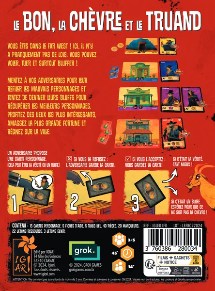 Au cœur d’un petit village du Far West, chacun cherche à s’enrichir plus vite que son voisin, quitte à sourire en coin pour mieux mentir. Le Bon, la Chèvre et le Truand installe une ambiance de duel permanent, où l’on se jauge plus qu’on ne joue réellement des cartes. Chaque personnage proposé à un joueur est une promesse : promesse d’or, de pouvoir… ou de catastrophe, si la fameuse chèvre s’invite dans votre jeu.