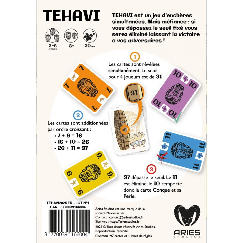 Fort d’une mécanique simple et intuitive, Tehavi offre de nombreux rebondissements et du suspens à chaque tour : le jeu parfait pour des parties uniques et amusantes d’environ 20 minutes.
